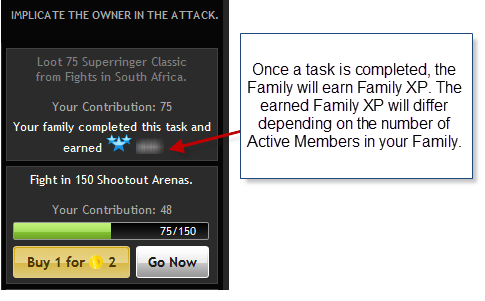 Once your Family completes a task within a Tier of any Path, the Family will receive Family XP. The Family XP pay-out will differ depending on the number of active members in your Family.