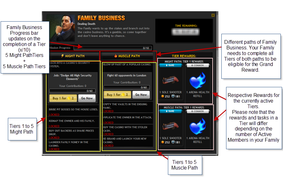 Muscle PathContribute to your Family Business by doing tasks in either one or both paths. Each path has 5 Tiers and the Rewards differ depending on the Tiers.